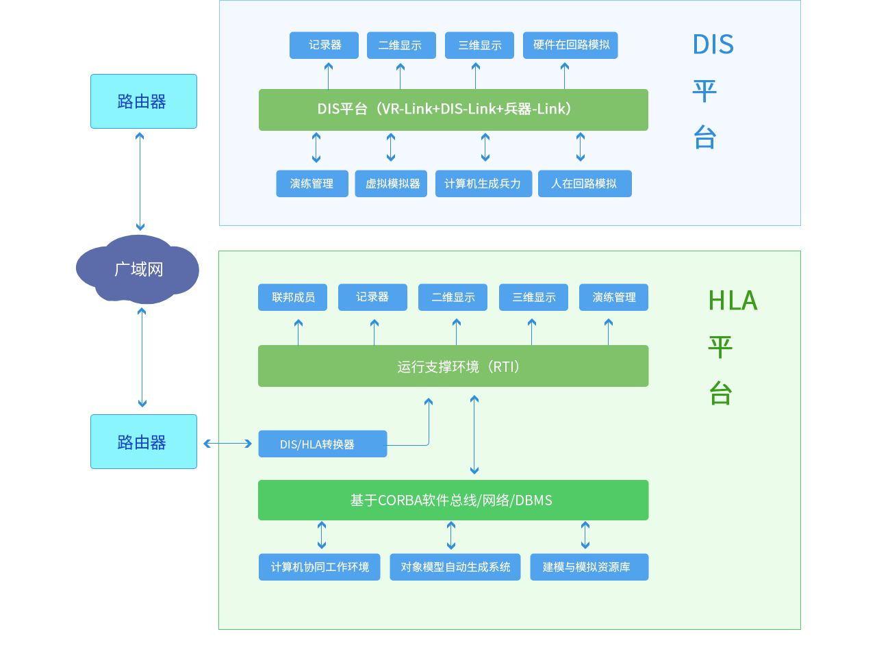 研究先進的仿真技術和方法,采用DIS、HLA、DDS、VR、VP及CGF等技術研制多款武器裝備配套的多功能和全任務模擬訓練器/系統平臺,聯合作戰模擬訓練和多武器仿真平臺的模擬訓練器/系統的新型混合體系結構示意圖。